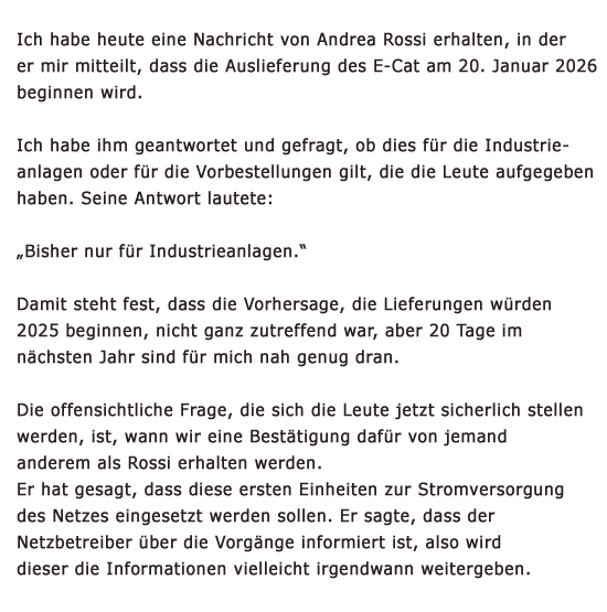 Die Vorbereitungen laufen auf Hochtouren und wir können erwarten, dass in den nächsten Monaten – etwa zeitgleich mit Rossi – diese Raumenergie-Container gleichzeitig in mehreren Ländern auf dem Markt kommen.